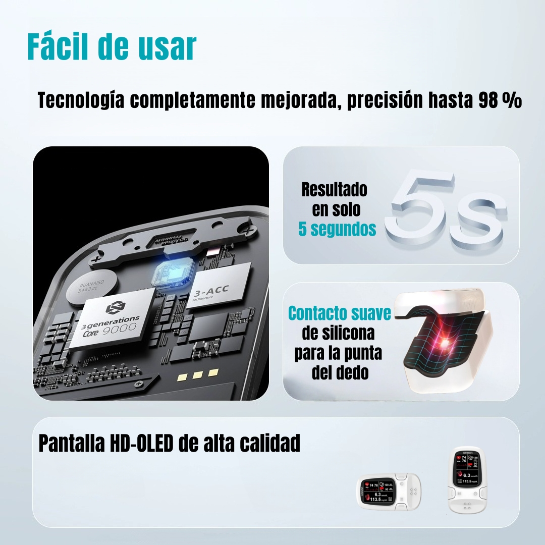 Registra todas las señales de pulso de manera rápida y con alta precisión. La combinación del chip de control MCU de ultra bajo consumo y el avanzado algoritmo "LAMBERT BEER" permite reconocer rápidamente las señales de medición, ofreciendo resultados más rápidos y precisos.