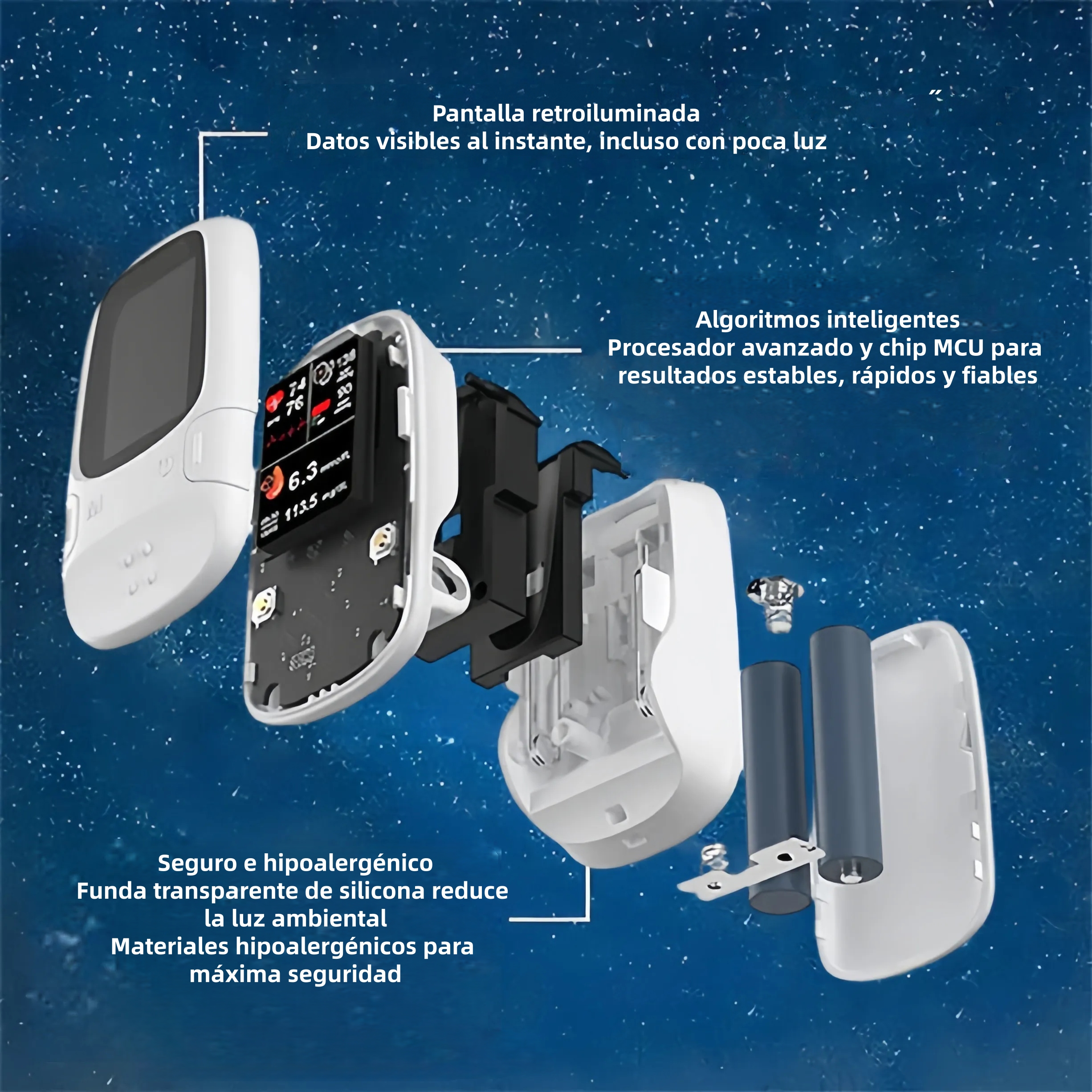 Gracias a la tecnología de chip fotónico y al proceso de medición del espectro de absorción óptica, el dispositivo proporciona valores de glucosa extremadamente precisos.
